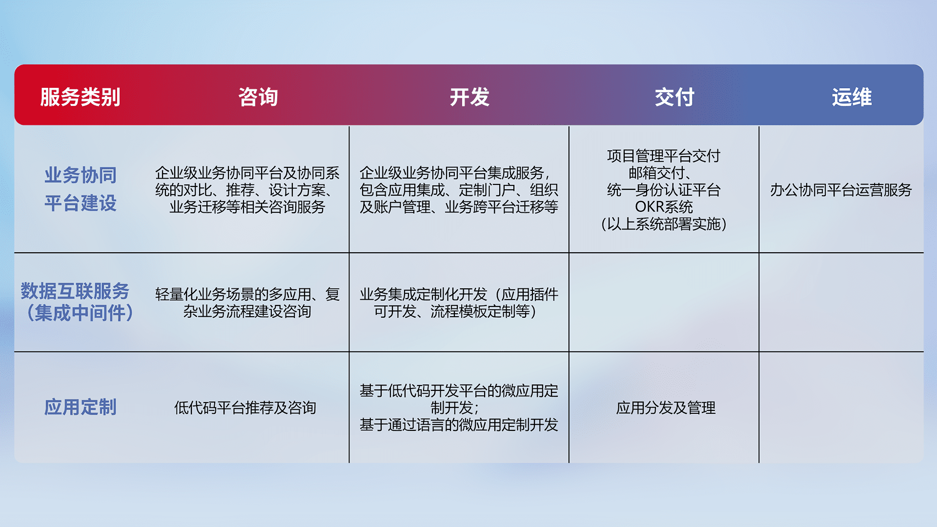 针对钉钉、、、企微、、、IDaas等平台级产品提供产品的规划、、、、方案、、、、交付、、、定制化开发等服务,,,,实现如统一协同办公、、智能客户服务、、、混合会议管理、、智能数据查询、、等业务场景,,,,实现数字化转型。。。